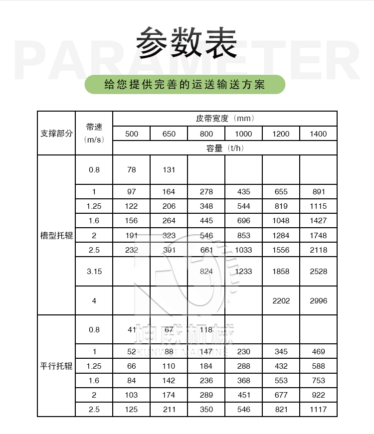 定貨時需注明:帶速、帶寬、輸送距離、輸送量、傾斜角度、物料特性、工作環(huán)境、堆積角度、皮帶材料等技術參數(shù)。