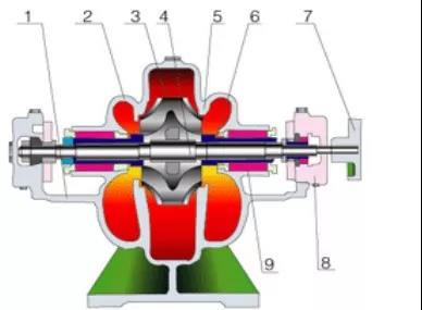 1、 泵體 2、泵蓋 3、葉輪 4、軸 5、雙吸密封環(huán) 6、軸套 7、聯(lián)軸軸器